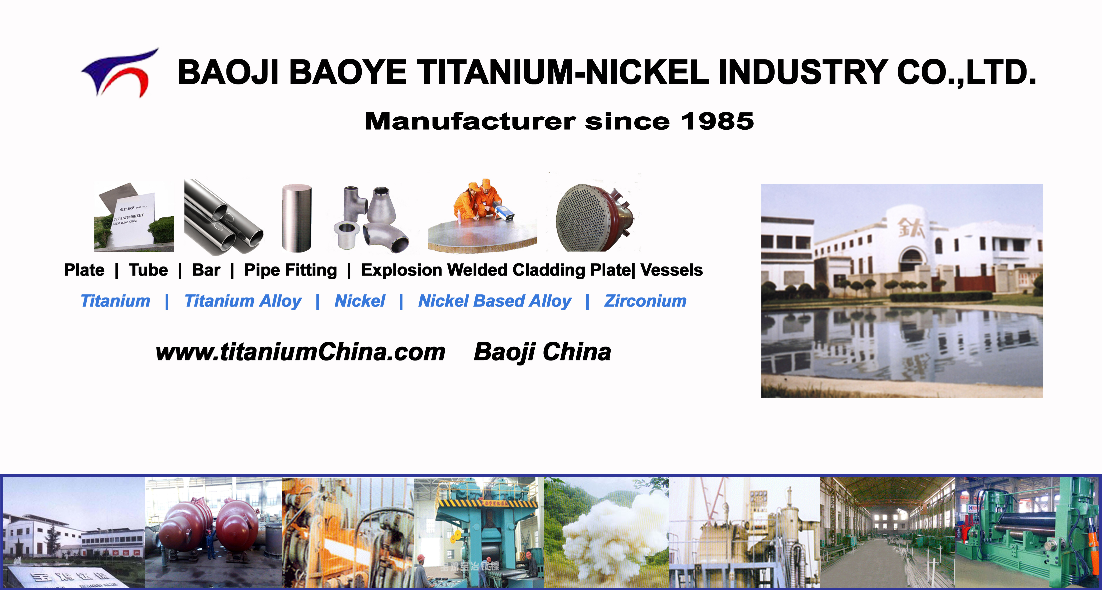 寶雞寶冶鈦鎳制造有限責(zé)任公司是生產(chǎn)鈦板材、鈦管材、鎳及鎳合金板材、鎳及鎳合金管材、鈦鋼復(fù)合板材、鎳鋼復(fù)合板材和鋯材料的企業(yè)。寶雞寶冶鈦鎳制造有限責(zé)任公司是制造鈦設(shè)備、鎳設(shè)備和其他金屬壓力容器設(shè)備企業(yè)。具備鈦制、鎳制A1級壓力容器設(shè)備設(shè)計資格和A2級壓力容器設(shè)備及非標(biāo)設(shè)備生產(chǎn)資格。公司的定型產(chǎn)品有:鈦、鎳制反應(yīng)釜、管制換熱器、板式換熱器、鈦泵、鈦制離心機(jī)、鈦鎳標(biāo)準(zhǔn)件、鈦鎳管件、鈦鎳絲材和鈦風(fēng)機(jī) 哈氏合金反應(yīng)釜,蒙乃爾反應(yīng)釜,英可600反應(yīng)釜.各類雙金屬復(fù)合板設(shè)備.